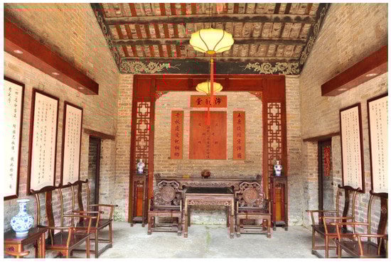 The name of the main hall is “Pei Guo Hall” (沛国堂) (Figure 7). It is the most important place in a home, where Zhu families gather together on regular basis. It is also a place to worship ancestors during various festivals. The sacred and daily life always meets in the hall, which constitutes a symbolic space for traditional Chinese families. A shrine is located in the end of the hall. In front of the shrine, there is a high footed table for ancestor worship. A couplet is displayed above the shrine to show the origin of the family and the respect to their ancestors.