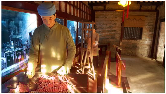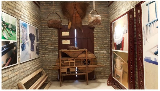 The local government contracted the specific construction tasks to professional companies. The restoration works were carried out to restore the original appearance of the ancient houses as much as possible. In the process of restoration, Nalu villagers’ opinions and suggestions were consulted and adopted. According to some villagers, each building unit had at least one plaque at its most glorious time. In the middle hall of the ancestral hall, there was a 2-m long and 1.2-m wide plaque with the characters “Da Ya Tang” (大雅堂), which literally means “the great elegant hall”. In the upper hall, there were warehouses on both sides of the ancestral hall, where there were 12 sedans, including four official sedans and four special “hovering” and “quiet” plates for senior officials. There were also eight flat sedans and various drums, gongs and flutes musical instruments for grand events and ceremonies. Although it is impossible to completely restore the old house according to its original appearance, the designers tried to inject the main “traditional” elements into the restoration and decoration of the old house (Figure 5). For example, the red lattice windows and wooden doors, as well as the shrine and ancestral tablet, traditional tables, chairs, and bed cabinets created the living scene of the folk houses at that time.