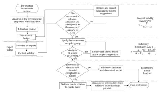 This investigation consisted of an instrumental study aimed at the development of tests and devices, including design, such as the study/analysis of psychometric properties [39] as shown in Figure 1.