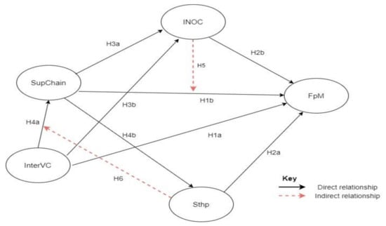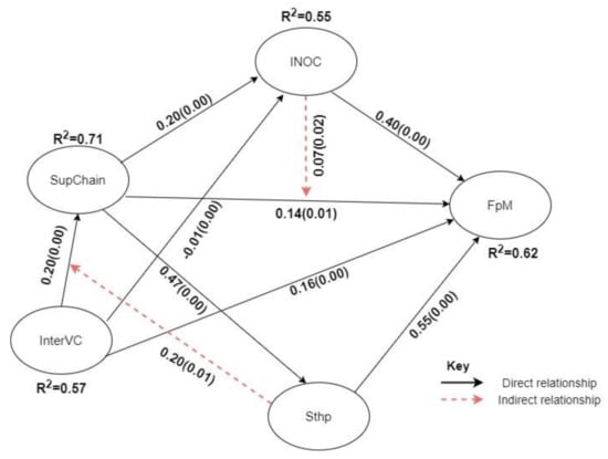 After fulfilling both the reliability and validity test, we test the study hypotheses using the smart PLS. Table 6 is the estimation output. At a 5% (0.05) significant level, we find that all the hypotheses (H1–H10) are accepted. However, except for the relationship between InterVC and InC, which is negative, all the other relationships are positive. Specifically, InterVC positively affects FpM. Thus, a unit increase in the InterVC activities improves FpM by 0.16a. This is consistent with the findings of existing studies [19,25]. SupC positively affects FpM; an increase in SupC activities increases FpM by 0.14a. This is why scholars advocate for the promotion of SupC between firms [17]. Again, we find that InterVC positively affects SupC within SMEs in Ghana. Thus, a unit increase in InterVC improves SupC by 0.20a. Empirically, InterVC activities are proven to encourage SupC within firms [24]. The relationship between ShP and SupC per our analysis is positive. This means an increase in ShP increases SMEs SupC activities in Ghana by 0.47a. Stakeholders exert pressure on management to make the right decisions for the benefit of all [27,32]. Further, we find that InC has a positive relationship with SupC. Statistically, a unit increase in InC increases SupC by 0.20a. This reveals the need for advanced technologies to adequately support the activities of SupC [9,10]. Again, we find ShP to positively affect FpM in Ghanaian SMEs. This means a unit increase in ShP increases FpM by 0.55a. This supports the significance of ShP in the effective and efficient management of businesses [32,34]. InC also shows a positive relationship with FpM in Ghanaian SMEs. InC is proven to be crucial in enhancing the efficiency and productivity of businesses [1]. Consequently, the results provide that an increase in InC increases FpM by 0.04a. However, the relationship between InterVC and InC is negative. This is inconsistent with existing literature [13]. An increase in InterVC negatively affects InC in Ghanaian SMEs. Rationally, we expected a positive relationship between these variables. Further, we estimated the mediating roles of InC and ShP on the relationships between SupC and FpM together with SupC and InterVC, respectively. We evidenced that InC positively mediates the relationship between SupC and FpM. This is consistent with the findings of existing studies. However, with a coefficient of 0.07b, the strength of the relationship witnessed between SupC and FpM at 0.14a is reduced. Finally, we find that ShP mediates the relationship between SupC and InterVC. This outcome is synonymous with the findings of existing studies [27,32]. Equally, the strength of this relationship is reduced given the coefficient of 0.02a compared to the original relationship with the coefficient of 0.20a.