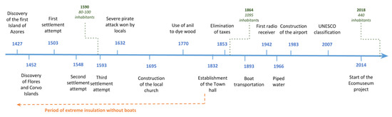 Until 1853 the island of Corvo was ruled by an owner to whom the inhabitants (corvinos) had to pay taxes (Figure 3). The first settlement phase was implemented in 1503–1508 with low success. After that initial phase, only the cattle remained. Two other settlement phases were carried out in 1548 and 1593.