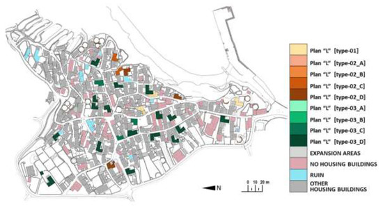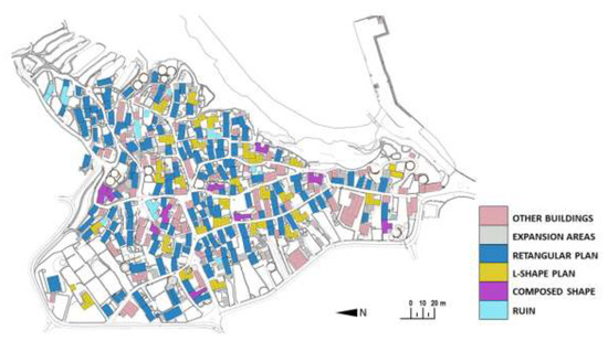 In the study area, there are currently 185 buildings with a predominant residential function: 140 (75.68%) have a rectangular-shaped floor plan, 29 (15.68%) have an L-shaped floor plan, 9 (4.86%) present other shapes, usually composed of different volumes, and the remaining 7 (3.78%) are in ruin and were excluded from this analysis. Figure 4 shows the distribution of these different types of buildings in the urban area. In the following sections, buildings with a rectangular or L-shaped floor plan are addressed, as they represent 91.36% of the island’s residential buildings.
