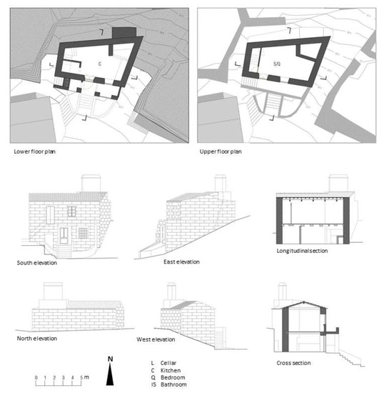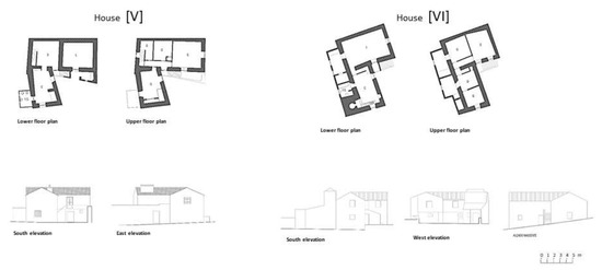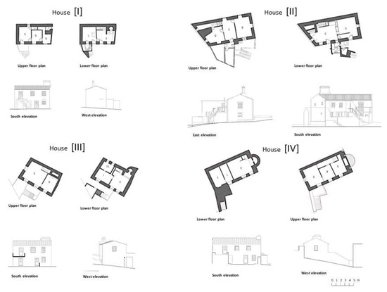 Like rectangular-shaped floor plan buildings, type 3_D buildings’ predominance is significant (two floors with indoor and outdoor stairs). In Figure 8, detailed drawings of two examples of buildings of this type are presented, whose functional organization can be briefly described as follows: