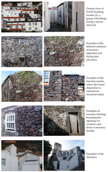 Since 2014 there has been extensive work developed by the Regional Directorate for the Culture of the Azores (Direção Regional de Cultura dos Açores) to promote and develop Corvo Island’s Ecomuseum project, with the main goal of recognizing and identifying the island’s identity, taking into account the participation of its community and perceiving this territory as a catalyst for local socioeconomic development capable of generating wealth and serving community interests [13]. This project includes the conservation of NAVC’s built heritage, which began with extensive work of in loco characterization and an analysis of NAVC buildings’ identity, which was developed by the Local Technical Office created for that purpose, composed of a team of architects and engineers since 2018. This process is particularly meaningful due to the importance of deep technical knowledge of the buildings’ architectural and constructive features, contributing to sustained choices of conservation and rehabilitation solutions.
