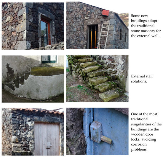Regarding windows, most buildings have wood window framings, although aluminum and PVC solutions are becoming more common, indicating the existence of interventions where the original framings are being replaced. Buildings with different window framing materials are also very frequent. Considering window typologies, single-hung wood framing solutions are the most common, sometimes painted white or left unpainted. The general lack of window sills was also observed, which are frequently materialized by the stone supporting the window framing.