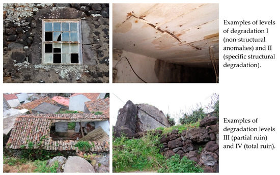 - Degradation level II—The building has walls, a roof, and an intermediate floor. However, the structure of the middle floor is unstable, has evidence of structural damage to the roof, or both. The buildings have pathologies such as lack of material, namely with voids in their stone walls, among others; and
