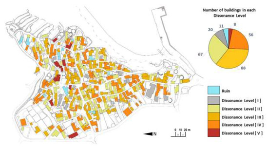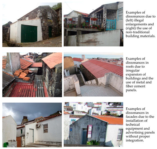 As mentioned in the Regulatory Decree [36], many interventions carried out over the years were not framed by a global strategy, nor supported by a detailed project, often leading to dissonances that need to be evaluated and, when necessary and possible, corrected. From the observation of the NAVC buildings, 26 types of alterations performed on buildings were considered to have led to significant dissonances. The buildings were grouped into levels of dissonance according to the following criteria: Level I—Does not present dissonances; Level I—Low: one to three dissonances; Level II—Medium: four to six dissonances; Level III—High: contains seven to nine dissonances; Level IV—Very high: contains more than 10 dissonances. Figure 14 illustrates some of the dissonances observed and Figure 15 shows the location of buildings in the urban grid according to this classification.
