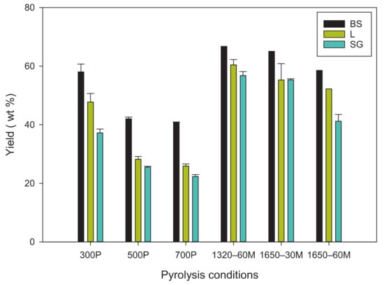 The biochar yield observed from the slow pyrolysis from the different feedstocks showed that BS had the largest yield across the three different temperatures (Figure 1). This might because the higher concentration of inorganic compounds and lower volatile organic contents in BS [29]. Both SG and L had yields between 20% and 30% for temperatures of 500 °C and 700 °C, but then increased to almost 40% and 50% at 300 °C, respectively. There was an interesting commonality among the three feedstocks: The 300 °C biochar had high variability (3–10 times more) in yield compared to the 500 °C and 700 °C.