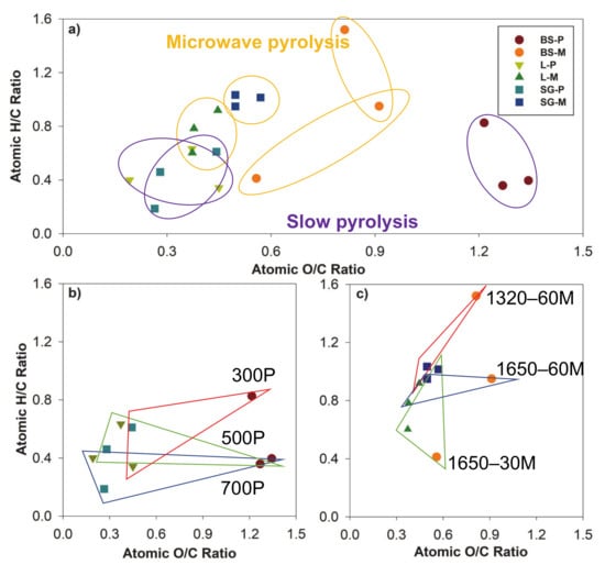 van Krevelen diagram of atomic ratios for biochar from biosolids (BS), switchgrass (SG), and water oak leaves (L) via slow pyrolysis (P) and microwave pyrolysis (M). (a) Comparison of all biochar; (b) Slow pyrolysis-derived biochar comparison (c) microwave-pyrolysis biochar comparison.