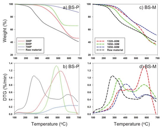 TGA (thermalgravimetric analyzer) of biosolid and resulting pyrolysis-derived biochar via (a) slow pyrolysis and (c) microwave pyrolysis; (b), DTG (derivative thermogram) curves of biosolid and resulting pyrolysis-derived biochar via (b) slow pyrolysis and (d) microwave pyrolysis. BS: Biosolids; P: Slow pyrolysis; M: Microwave pyrolysis.