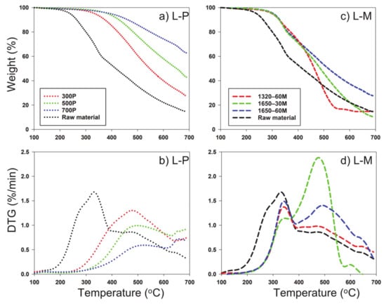 TGA (thermalgravimetric analyzer) of water oak leaves and resulting pyrolysis-derived biochar via (a) slow pyrolysis and (c) microwave pyrolysis; (b), DTG (derivative thermogram) curves of biosolid and resulting pyrolysis-derived biochar via (b) slow pyrolysis and (d) microwave pyrolysis. L: Water oak leaves; P: Slow pyrolysis; M: Microwave pyrolysis.