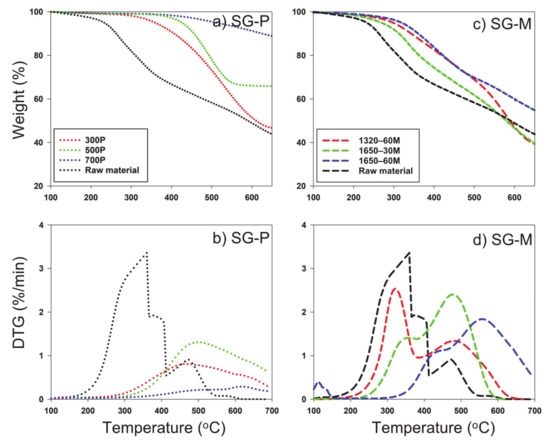 TGA (thermalgravimetric analyzer) of switchgrass and resulting pyrolysis-derived biochar via (a) slow pyrolysis and (c) microwave pyrolysis; (b), DTG (derivative thermogram) curves of biosolid and resulting pyrolysis-derived biochar via (b) slow pyrolysis and (d) microwave pyrolysis. SG: Switchgrass P: Slow pyrolysis; M: Microwave pyrolysis.