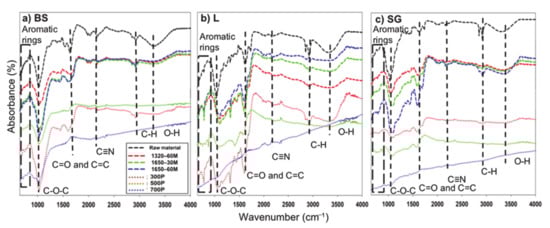 Surface structures were observed from the infrared spectra of the biochar and their respective feedstock at the various slow and microwave pyrolysis syntheses (Figure 6). The spectral peaks enabled the diverse functional groups in the raw feedstock, microwave-mediated, and low temperature samples to be evident. The raw feedstocks, all microwave-derived biochar, and slow pyrolysis at 300 °C (except for SG) detected the unstable functional groups of O–H (~3400 cm−1) and alkyl C–H (~3000 cm−1). This occurrence was attributed to the breaking of hydroxyl groups of aliphatic groups which occur between 120 and 200 °C. The further increasing of temperature to 400 °C cause the breaking of the aliphatic methoxyl, methyl, and methylene groups [9]. For most feedstocks and biochar except at 700 °C, and in BS- and SG-500 °C, broadbands near 1000 and 1700 cm−1 were still evident.