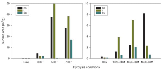 The surface area and porosity of biochar have been noted as two of the most critical properties for nutrient sorption of biochar [42]. The greater surface area the biochar contains per gram can promote increased space for adsorption along with more microbial communities to grow and assist in crop growth [30]. There were many similarities discovered in the surface area between the different specimens (Figure 7). For slow pyrolysis-derived biochar at 500 °C, the highest surface area was recorded for L and BS at 42 m2 g−1 and 29 m2 g−1, respectively. Whereas the 700 °C biochar had the most surface area for SG at 18 m2 g−1. The feedstocks showed varied results. SG was collectively the feedstock with the least surface area among all the variations of slow and microwave pyrolysis derived. The other two feedstocks had similar surface areas which were contained between 2–10 m2 g−1, with the exception of the 500 and 700 °C samples. Higher temperature/energy input was expected to yield a more porous/increased surface area biochar due to more mesopores and micropores being formed from the intensified structural condensation [26]; however, decreased pore size is a consequence of high temperature/energy input pyrolysis. The microwave pyrolysis-derived biochar for SG showed consistent results (0.5–2 m2 g−1), despite the increase in power or time. While the highest specific surface area for BS was 1650–60M (8.3 m2 g−1) and L 1650–30M (7.2 m2 g−1), respectively. Compared to the feedstocks, there was at least a 350% increase in specific surface area as energy was used to heat the feedstocks. The elevated power level increased heat energy that led to enhanced carbonization, which allowed more volatile matter to be released, theorized to create more pores in remaining non-volatile parts [30]. Therefore, results showed promise to be a successful soil amendment to adsorb N nutrients and facilitate plant growth.