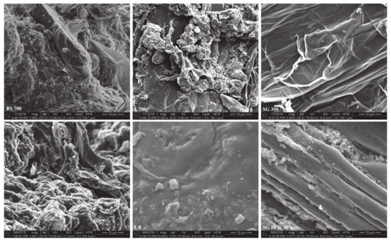 BS specimens were expected to contain the highest surface area as the temperature and radiation level increased (Figure 7), as well as by the evident amount of pore space shown from the SEM images (Figure 8). The BS feedstock showed the most visual surface area from SEM. L surface was primarily smooth across all versions of the biochar species, but there was an area that showed capacity for an increased amount of surface are. For the SG biochar, there was primarily strings of parallel rods that ran the length of the sample. Within these rods there were strings of silicon bands that remained within the biochar (found via Energy Dispersive Spectroscopy detector). Between SG 1320–60M and SG 1650–60M, the increased energy dissipation onto the biochar provided clear deterioration of the surface, creating grooves along the length of the specimen, indicating an increased surface area when energy was increased.