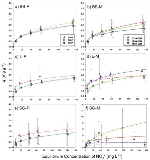 Sorption isotherms of NO3− for biochar specimens. Pyrolysis-derived biochar: (a,c,e); microwave-mediated biochar: (b,d,f). (Dashed lines indicate fitted Fruendlich sorption model for respective colored data). L: Water oak leaves; SG: Switchgrass P: Slow pyrolysis; M: Microwave pyrolysis.
