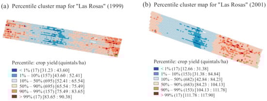 Percentile cluster map based on corn yield data (yield values in quintals per hectare) for: (a) “Las Rosas” farm corn yield data (1999) and (b) “Las Rosas” farm corn yield data (2001).