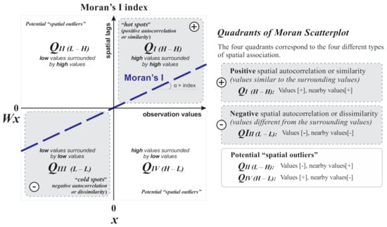 The local indicator of spatial association (LISA) as defined a statistic that satisfies two main requirements [43]: (1) LISA value gives an indication of the extent of significant spatial clustering of similar values around an observed value; (2) the sum of all LISA values for all observations is proportional to a global indicator of spatial association. The corresponding scatter plot for Moran’s I values is used to provide a visual exploration of global spatial autocorrelation (Figure 2).