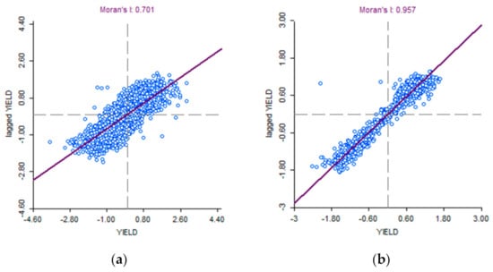 Univariate Moran’s I scatter plot for: (a) “Las Rosas” farm corn yield data (1999) and (b) “Las Rosas” farm corn yield data (2001).