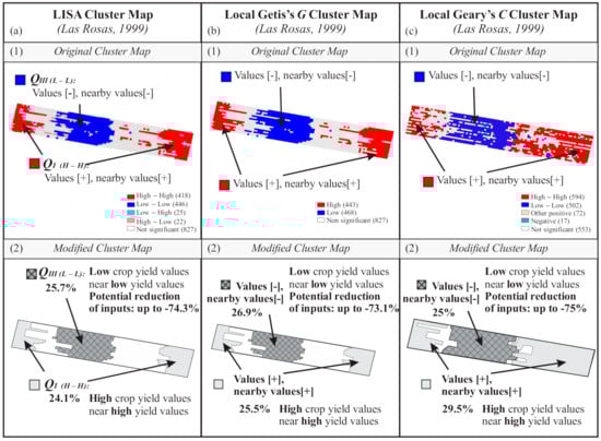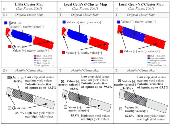 Cluster maps for “Las Rosas” farm corn yield data (2001) for: (a) LISA and (b) Local Getis G, and (c) Local Geary C, where (1) the original cluster maps and (2) modified and simplified version of the corresponding cluster map focusing on areas with low crop-yield values. A potential reduction in inputs has been calculated in each case.