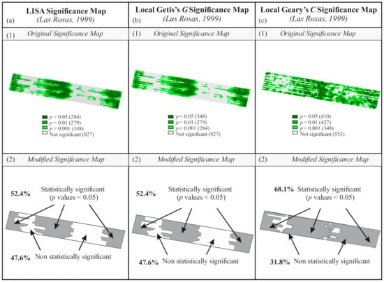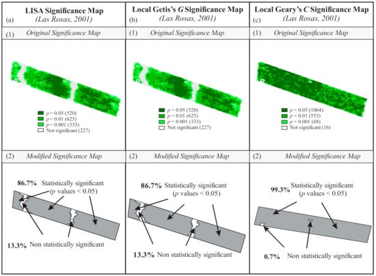 Significance maps for “Las Rosas” farm corn-yield data (1999) for: (a) LISA, (b) Local Getis G, and (c) Local Geary C, where (1) the original cluster maps and (2) modified and simplified version, grouping statistically (p values < 0.05) and non-statistically significant areas.