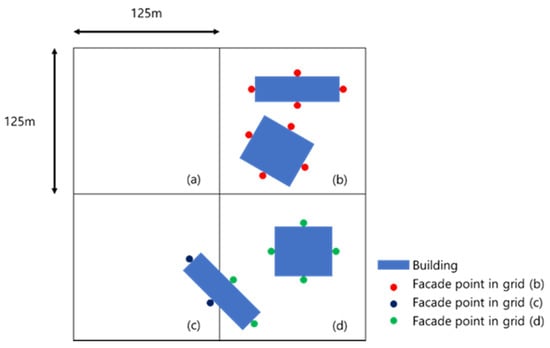 Representative values of the road-traffic noise level were calculated for each grid cell from an existing noise map [39] by averaging daytime noise levels on every facade of the buildings that were included in the grid cell. In previous studies [23,25], population (inhabitant)–weighted averaging was used to estimate representative values of the road-traffic noise level for grid cells. Calculation of population (inhabitant)–weighted averaging noise levels is suitable for estimating the noise exposure in residential areas. However, the purpose of estimating the representative value of the road-traffic noise level in this study was to understand the noise distribution throughout the city regardless of land use. Therefore, the representative value of the road-traffic noise level for each grid cell should reflect the averaged noise level of all buildings in the grid cell. As shown in Figure 2a, the grid cell which does not contain any building was not considered for the statistical analysis, and the numbers of valid grid cells were 11,990 for Gwangju and 4173 for Cheongju, respectively. In grid cells that contained only whole buildings, such as in Figure 2b, all the facade noise levels were used to calculate the representative value. For buildings that were straddled over multiple grid cells, as in Figure 2c,d, only the facade noise levels contained in each grid cell were used for the calculation. The representative value of the road-traffic noise level, defined as L, was measured as follows:
