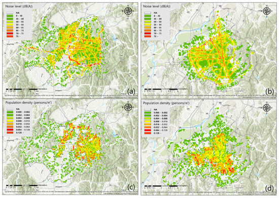 Grid maps of: (a) L (road-traffic noise level) in Gwangju; (b) L (road-traffic noise level) in Cheongju; (c) P (population density) in Gwangju; (d) P (population density) in Cheongju [44,45].