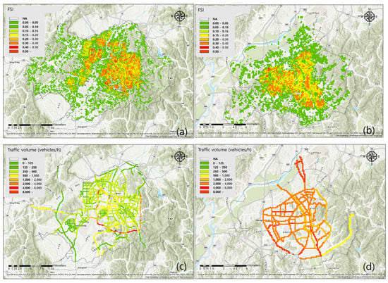 Grid maps of: (a) FSI (floor space index) in Gwangju; (b) FSI (floor space index) in Cheongju; (c) Q (traffic volume) in Gwangju; (d) Q (traffic volume) in Cheongju. [44,45].