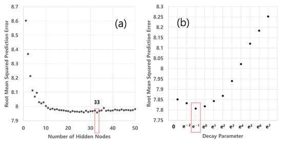 Minimal root mean square error (RMSE) investigation to optimize the artificial neural network (ANN) model parameters: (a) number of hidden nodes; (b) decay parameter (number of hidden nodes = 33).