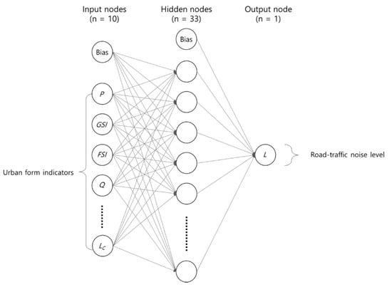 Artificial neural network (ANN) models have been used to predict road-traffic noise at specific points with traffic flow characteristics (e.g., traffic volume, speed, and heavy vehicle ratio). Kumar et al. [31] fitted an ANN model with measured road-traffic noise levels, traffic volume, speed, and heavy vehicle ratios, and the predicted noise levels using the ANN model were closer to the measured noise levels than were the levels predicted with the ordinary least squares (OLS) model. Garg et al. [32] predicted road-traffic noise levels (Leq, L10) with a total of eight explanatory variables: the volumes of cars, two-wheelers, medium commercial vehicles, three-wheelers, buses, and trucks and the speeds of heavy and light vehicles. The predicted noise levels using the ANN model were closer to the measured noise levels than the predictions from the multiple linear regression analysis. Hamad et al. [33] fitted an ANN model predicting road-traffic noise levels in a city with a hot climate. The ground temperature and acoustical factors, such as distance from noise source (road), traffic volume, and speed, were used. The database was applied to a basic statistical traffic noise model, the Ontario road noise analysis method for the environment and transportation (ORNAMENT), and the ANN model. The predicted road-traffic noise level from the ANN model was closer than the other models to the measured noise level. Similar to these studies, ANN models that predict the road-traffic noise level based on measured traffic data were developed to replace traditional road-traffic noise prediction [34,35,36].