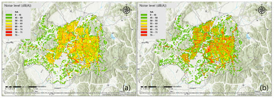 Statistical road-traffic noise map of Cheongju: (a) ANN model; (b) OLS model [44,45].