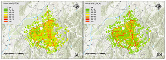 Statistical road-traffic noise maps of Gwangju: (a) ANN model; (b) ordinary least squares (OLS) model. [44,45].