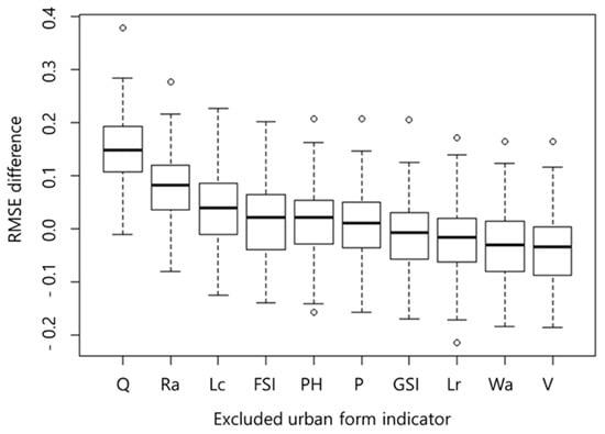 The effects of urban form indicators on road-traffic noise prediction in the ANN model were tested by excluding urban form indicators one by one. Ten test ANN models were developed using only nine urban form indicators, excluding one urban form indicator, and the excluded urban form indicator was the subject of a test. RMSE differences between each test model and the complete ANN model, which are shown in Figure 6, were compared. The larger the difference in the RMSE, the more important the excluded indicator was. Figure 9 shows the RMSE differences for each urban form indicator.