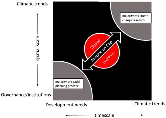 Current achievable policy outcomes are rooted in an existing context of political negotiations and compromises in governance. Wicked problems cannot be dealt with using linear answers—a common mistake. A ‘negotiated average’ provides solutions for an already changed problem the moment the solution is brought forward, contradicting the long-term larger scale [], forming an adaptation gap [,]. Planning that responds to emergencies is continuously ‘muddling through’ [], while uncertainty and wicked problems [] require ‘unsafe planning’ [], bridging this gap (Figure 1).