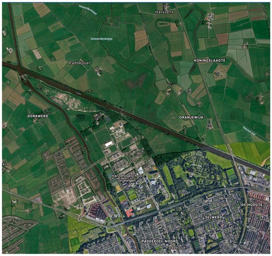 Climate adaptation is viewed as a spatial challenge [], positioning ‘design’ to discover holistic solutions [,,]. This way, adaptation is designed for the Zernike campus, located on the northern fringe of the city of Groningen in the Netherlands (Figure 2). This university campus is home to two universities, several research institutes, and many enterprises and start-ups. It hosts approximately 30,000 people, including students and staff. The Moeder Zernike project is part of the design-manifestation of the Climate Adaptation Week Groningen, in which the task is to propose solutions for a 100-year future.
