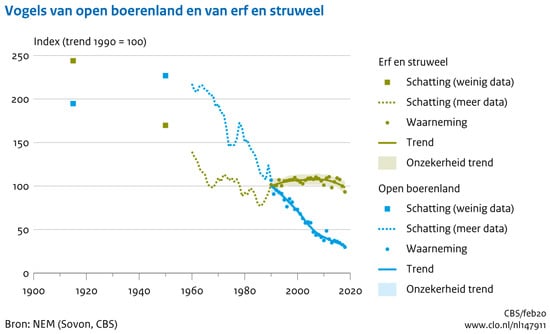 Trends in bird populations open farmland in the Netherlands (in blue) [].