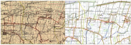 A few crops, including potatoes, wheat, and sugar beet, and grassland dominate the current agriculture in Groningen [], and these land uses lead to the dewatering of peatlands, causing carbon emissions constituting approximately 40% of the total Groningen emissions from agriculture []. The EU subsidizes agricultural production, and due to future reduction in these subsidies [], farmer’s incomes are increasingly under pressure. Globally, food security concerns rise []. Groningen’s agriculture is not capable of feeding its own population, and it must therefore import food from around the globe. Food safety poses another serious risk [], as it may cause illnesses, epidemics, or pandemics. Dewatering in combination with relative sea level rise causes soil subsidence and increasing salinity []. This problem has increased through recent droughts [], creating additional risks for the fresh water-dependent crops. In Groningen, agriculture has undergone a transformation. As part of general developments in the Netherlands [], land consolidation in the 20th century led to larger parcels (Figure 4), increasing the vulnerability to illnesses and economic change.