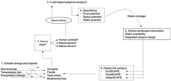 Global climate change impacts the future of urbanism. The future is increasingly uncertain, and current responses in urban planning practice are often human-centered. In general, this is a way to respond to change that is oriented towards improving the life of people in the short term, often extracting resources from the environment at dangerous levels. This impacts the entire ecological system, and turns out to be negative for biodiversity, resilience, and, ultimately, human life as well. Adaptation to climatic impacts requires a long-term perspective based in the understanding of nature. The objective of the presented research is to find explorative ways to respond to the unknown unknowns through designing and planning holistically for the Zernike campus in Groningen, the Netherlands. The methods used in this study comprise co-creative design-led approaches which are capable of integrating sectoral problems into a visionary future plan. The research findings show how embracing a nature-driven perspective to urban design increases the adaptive capacity, the ecological diversity, and the range of healthy food grown on a university campus. This study responds to questions of food safety, and growing conditions, of which the water availability is the most pressing. Considering the spatial concept, this has led to the necessity to establish a novel water connection between the site and the sea.