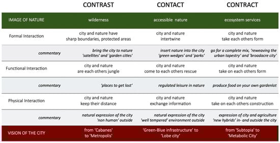The main objective is to take nature as the basis for the urban transformation. In this sense, the city is seen as being part of nature. This could be a bold statement; however, the city of Rotterdam recently presented itself as a wilderness park because its urban wildlife is so abundant []. Being part of nature enhances the health not only of the urban wilderness, but also of its human inhabitants when living close to green areas []. Developing urban areas need to achieve balance in the exchange of materials, resources, and the potential to allow co-existential living systems, urban and natural, to emerge and evolve by creating regenerative cities [,,,]. However, cities, having extracted natural resources at a large scale ever since the industrial revolution, should become reciprocal []. Three gradations of responsiveness are distinguished (Figure 6): searching for human-centred contrast, establishing nature-driven contact, and striving for nature-driven contract [].