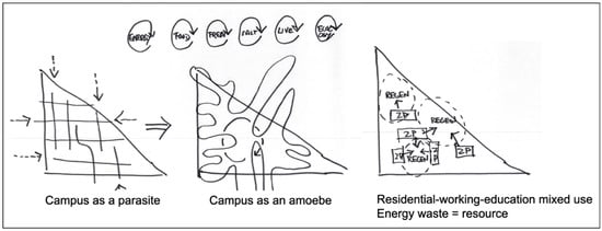 - After the preferred viewpoint is chosen, the core question of how to design a campus that could be self-reliant is investigated. Through literature review of the concepts of self-reliant areas [,,,] and self-sufficiency [,,], the programmatic contours for the design are formulated.