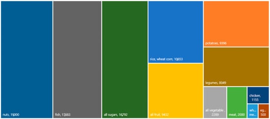 Firstly, the amount of food required to provide the new diet [], based on a per person estimation of food categories (Figure 8) applied to all consumers on campus (30,000 students and staff and an additional 10,000 of new residents), is calculated. These amounts are combined with the number of meals the different groups, students, staff, and residents, consume on campus, taking into account holiday periods. The total amount of food needed is almost 5.5 million kg per year.