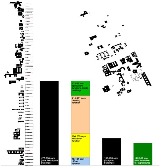 The area needed for growing all crops (Figure 9) adds up to an area of approximately 0.1 km2 (or 100,000 m2). Assuming the largest portion of these crops will grow inside, on rooftops, or clinging to the facades of campus buildings, using novel multiple harvest technologies, such as aqua- and aeroponics, the useable spaces of current buildings is calculated (Figure 10). Potentially 140,000 m2 of rooftop area and 90,000 m2 indoors is available. Additionally, inside existing buildings, almost 10,000 homes can be realised. The total area for growing food on Zernike is 230,000 m2, more than twice the required space.