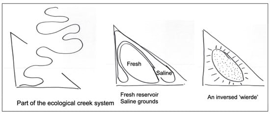 The soil in the landscape of the Groningen area is subjected to a toxic mix of increasing salinity [,,], soil subsidence resulting from dewatering the agricultural lands in conjunction with peat oxidation [,,,] and gas extractions [,,], and the desiccation of the land [,], mutually exaggerating each other’s impacts. Dewatering of the land causes soil subsidence, increasing the influence of seepage from the sea, which is even more detrimental due to the land drying out as result of climatic droughts. Increasing differences between the level of the land and the rising sea strengthens salinification, which causes further dewatering, which, in turn, causes additional soil subsidence, subsequently exaggerating salinity. This vicious circle of land degradation leads to ever more compromised conditions for growing food, induces a strictly controlled and managed water system, causes further loss of biodiversity, and instigates an (assumed) need to raise dikes to prevent the land from flooding. The impact of this process on traditional forms of agriculture in the northern Netherlands makes it difficult for these farming types to stay economically viable. Salinity alone is leading to an economic loss of EUR 1166/ha for potato fields [].