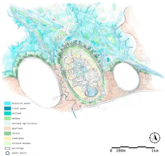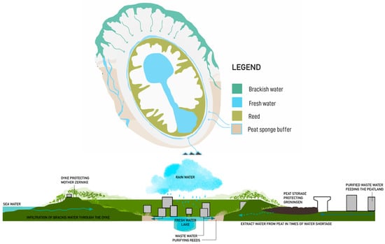 By connecting the campus with the sea, saline, brackish, and fresh water are all part of the waterscape (Figure 15). The protective sand edge purifies the saline water before it enters campus, at the same time protecting Moeder Zernike against the spring tide. All wastewater from buildings is filtered and cleaned in a helophyte system, making it usable for growing crops. During periods of heavy rainfall, the central lake fills up, is home to fish, provides the water for indoor crop growth, and cools the environment on hot days. The pond also functions as a heat exchanger, generating energy. Slowly growing peat is supplied with pre-purified household water from urban neighborhoods.