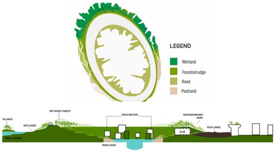 Ecological qualities are enhanced, bringing brackish and saline waters together with freshwater conditions, kindling new gradients. A diverse range of ecotypes emerge (Figure 16), such as new islands and wetlands, occasionally flooding, while other parts permanently rise above the water level. The reed-lands of the helophytes are home to insects, small fish, and reptiles, in turn attracting all kinds of birds. An abundant range of species inhabit the inner side of the ridge. Built structures will offer a unique rock-biotope for specific plants, butterflies, bees, and nesting places for birds and bats. Finally, peatlands offer a habitat to water birds, insects, and a range of reed plants.