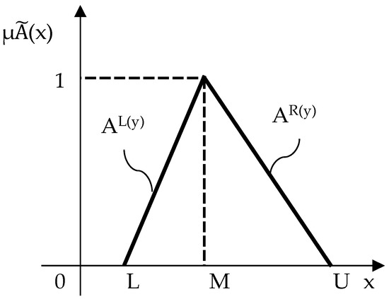 - Calculation of the fuzzy geometric mean value of each risk factor i, according to Buckley’s approach (Equation (11)):Upon determination of geometric means, the vector of fuzzy geometric risk factors is formulated (Equation (12)):