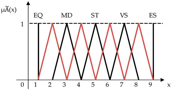 - Step-7: Definition of the fuzzy risk factors (i.e., the fuzzy relative weights) i, as follows (Equation (13)):