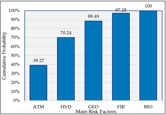 - Another remarkable observation is the high score of the cumulative probability of the meteorological and hydrological risks, which equals to 70.24% (Figure 4). This finding reflects the serious concerns of experts on the effects of climate change that might constitute an emerging and high consequence risk factor as reported in the literature in mine damages of a large scale [44,45,80]. Finally, the biological factors, although evaluated as of meagre probability score (2.75%), require further investigation with a focus on the widespread impacts in the mining industry, and beyond to the energy economy, as lessons of the COVID-19 pandemic crisis are dictating.