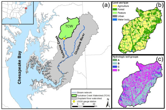 Characteristics of the study area (Tuckahoe Creek Watershed): (a) location; (b) land use type; and (c) hydrologic soil groups (HSGs; adapted from Lee et al. [39]) Note: HSGs are characterized as follows: type A are well-drained soils with a water infiltration rate of 7.6–11.4 mm·h−1; type B are moderately well-drained soils with 3.8–7.6 mm·h−1; type C are moderately poorly-drained soils with 1.3–3.8 mm·h−1; and type D are poorly-drained soils with 0–1.3 mm·h−1 [40].
