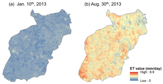 Examples of remotely sensed evapotranspiration (RS-ET) from ALEXI/DisALEXI on (a) 10 January 2013; and (b) 30 August 2013.